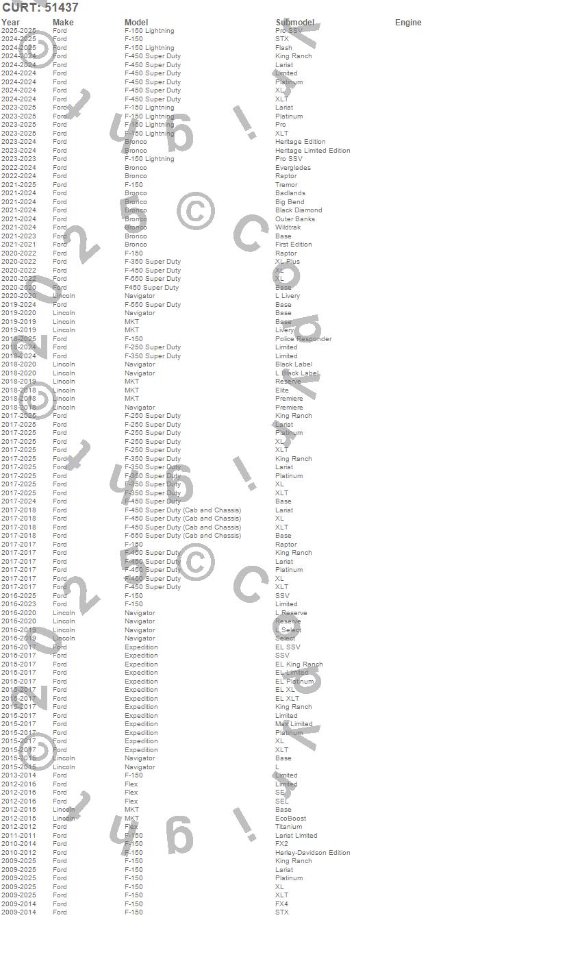 Brand: CURTPart Number: 51437Trailer Brake Control Wire Harness Type: Incl. OEM Connector - 2 ft. Wire - Protective Sleeve - 12 Ga. Wire - w/Quick Plug - PackageUPC: 612314024445