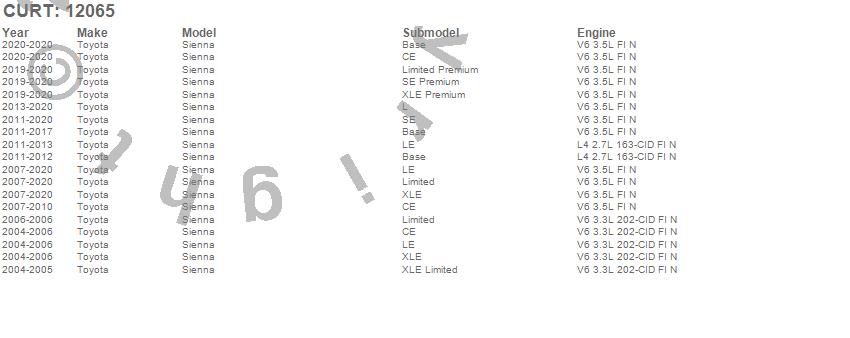 Below is an abbreviated list of applications for the Class II 1.25 in. Receiver Hitch.Sienna, Toyota, 2020, 2019, 2018, 2017, 2016, 2015, 2014, 2013, 2012, 2011, 2010, 2009, 2008, 2007, 2006, 2005, 2004