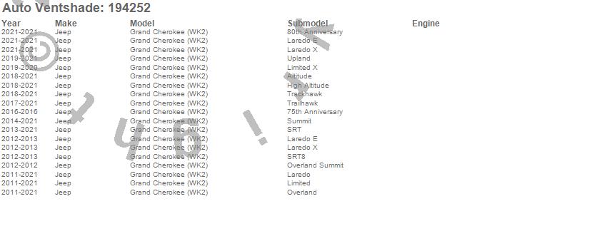 Below is an abbreviated list of applications for the Ventvisor In-Channel Deflector 4 pc..Grand Cherokee (WK2), Jeep, 2021, 2020, 2019, 2018, 2017, 2016, 2015, 2014, 2013, 2012, 2011
