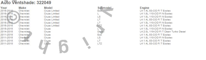 Below is an abbreviated list of applications for the Aeroskin Smoke Hood Protector.Cruze, Cruze Limited, Chevrolet, 2016, 2015, 2014, 2013, 2012, 2011