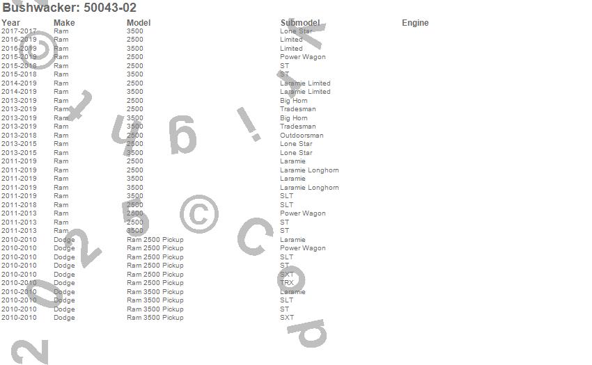 Below is an abbreviated list of applications for the OE Style Fender Flares.2500, 3500, Ram 2500, Ram 3500, Dodge, Ram, 2019, 2018, 2017, 2016, 2015, 2014, 2013, 2012, 2011, 2010