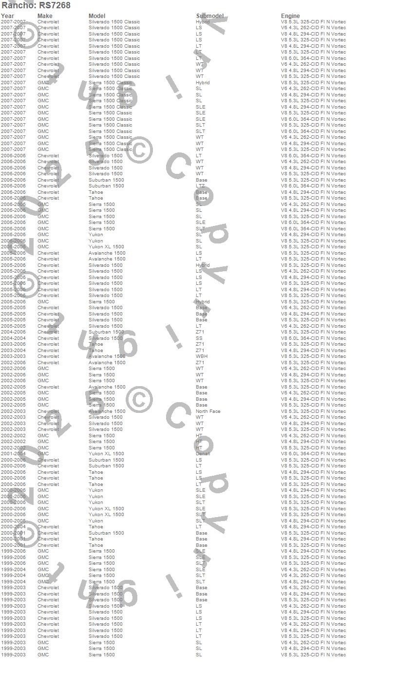 Below is an abbreviated list of applications for the RS7000MT Monotube Shock.AVALANCHE 1500, AVALANCHE 2500, H2, RAM 1500 PICKUP, SIERRA 1500, SIERRA 1500 CLASSIC, SIERRA 1500 HD, SIERRA 1500 HD CLASSIC, SIERRA 2500, SIERRA 2500 HD, SIERRA 2500 HD CLASSIC, SILVERADO 1500, SILVERADO 1500 (Canadian), SILVERADO 1500 CLASSIC, SILVERADO 1500 HD, SILVERADO 1500 HD CLASSIC, SILVERADO 2500, SILVERADO 2500 HD, SILVERADO 2500 HD CLASSIC, SUBURBAN 1500