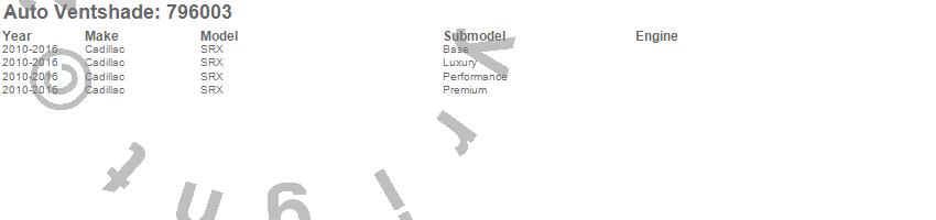 Below is an abbreviated list of applications for the Ventvisor Low Profile Deflector 6 pc..SRX, Cadillac, 2016, 2015, 2014, 2013, 2012, 2011, 2010
