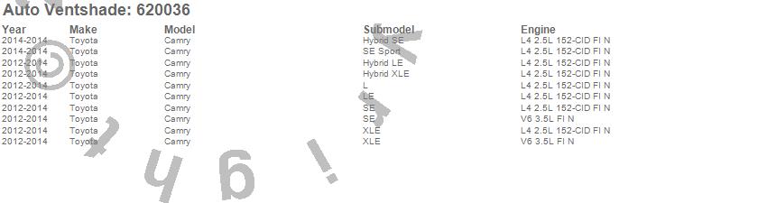 Below is an abbreviated list of applications for the Aeroskin Chrome Hood Protector.Camry, Toyota, 2014, 2013, 2012
