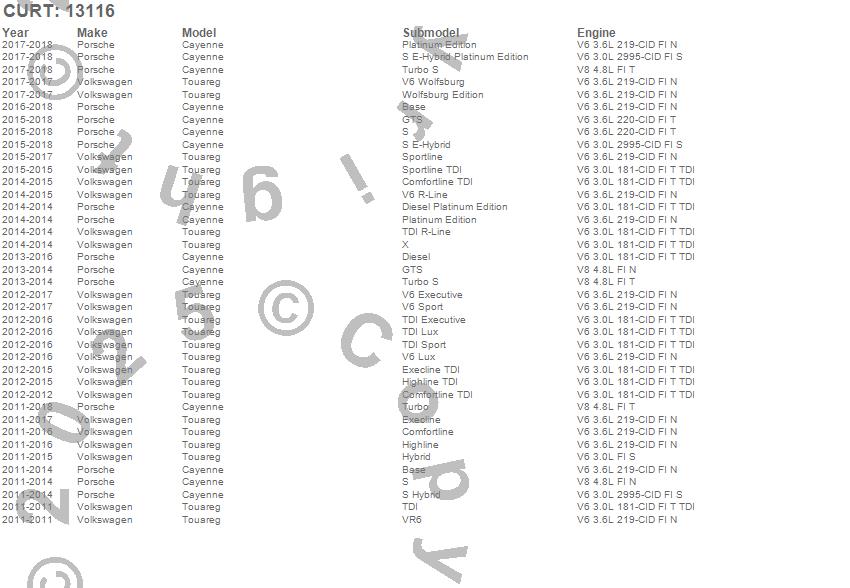 Below is an abbreviated list of applications for the Class III 2 in. Receiver Hitch.Cayenne, Touareg, Porsche, Volkswagen, 2018, 2017, 2016, 2015, 2014, 2013, 2012, 2011