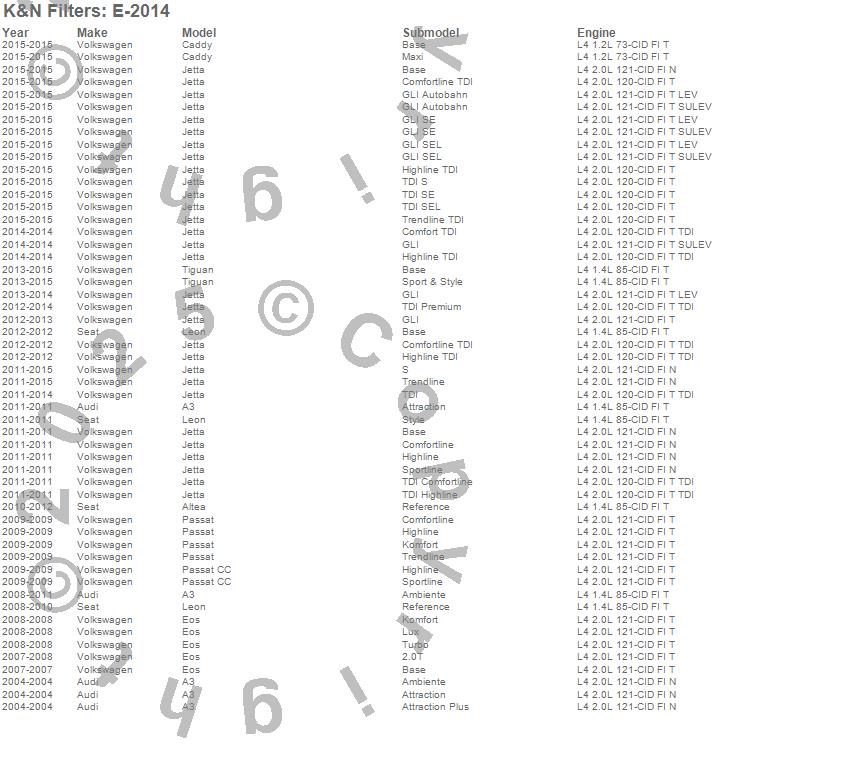 Below is an abbreviated list of applications for the Air Filter.A3, Altea, Eos, Jetta, Leon, Passat, Passat CC, Audi, Seat, Volkswagen, 2015, 2014, 2013, 2012, 2011, 2010, 2009, 2008, 2007