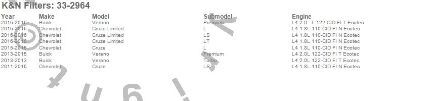 Below is an abbreviated list of applications for the Air Filter.Cruze, Verano, Buick, Chevrolet, 2016, 2015, 2014, 2013, 2012, 2011