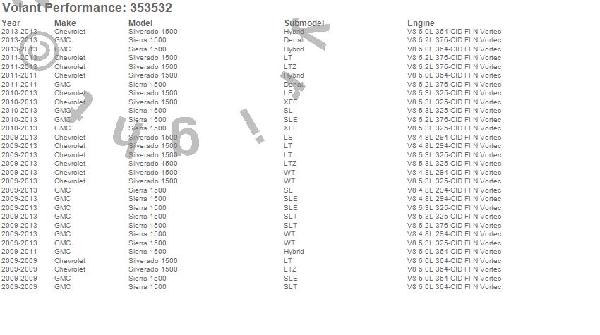 Below is an abbreviated list of applications for the Cold Air Intake Kit.Sierra 1500, Silverado 1500, Chevrolet, GMC, 2013, 2012, 2011, 2010, 2009