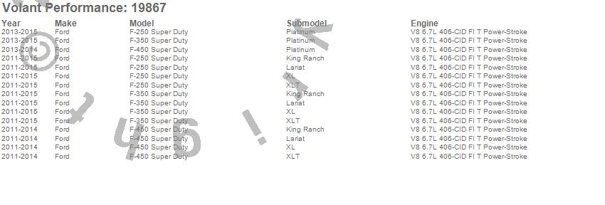 Below is an abbreviated list of applications for the Cold Air Intake Kit.F-250 Super Duty, F-350 Super Duty, F-450 Super Duty, Ford, 2015, 2014, 2013, 2012, 2011