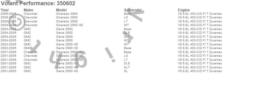 Below is an abbreviated list of applications for the Cold Air Intake Kit.Sierra 2500 HD, Sierra 3500, Silverado 2500 HD, Silverado 3500, Chevrolet, GMC, 2005, 2004, 2003, 2002, 2001