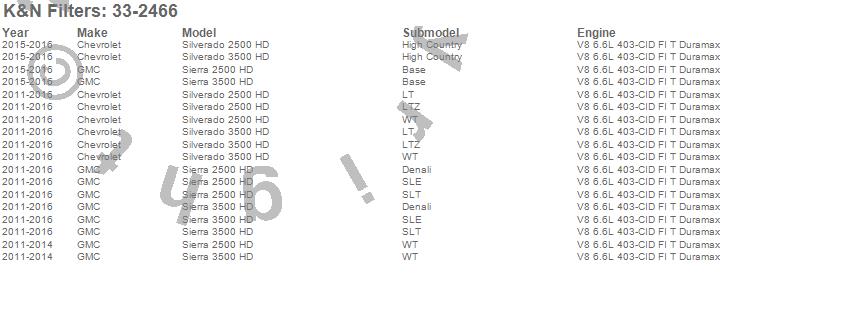 Below is an abbreviated list of applications for the Air Filter.Sierra 2500 HD, Sierra 3500 HD, Silverado 2500 HD, Silverado 3500 HD, Chevrolet, GMC, 2016, 2015, 2014, 2013, 2012, 2011