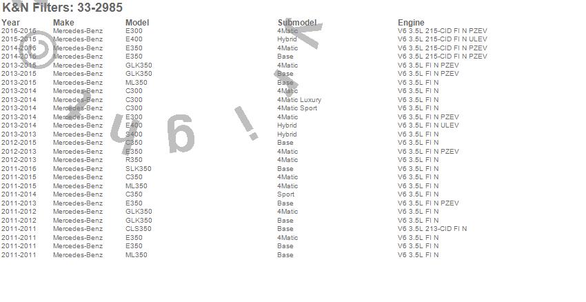 Below is an abbreviated list of applications for the Air Filter.C300, C350, CLS350, E300, E350, E400, GLK350, ML350, R350, S400, SLK350, Mercedes-Benz, 2016, 2015, 2014, 2013, 2012, 2011