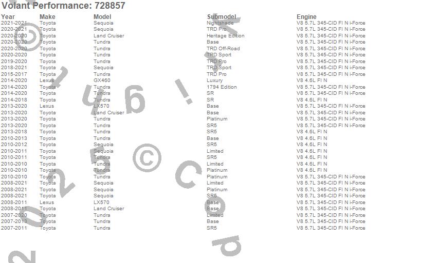 Below is an abbreviated list of applications for the Vortice Throttle Body Spacer.GX460, Land Cruiser, LX570, Sequoia, Tundra, Lexus, Toyota, 2021, 2020, 2019, 2018, 2017, 2016, 2015, 2014, 2013, 2012, 2011, 2010, 2009