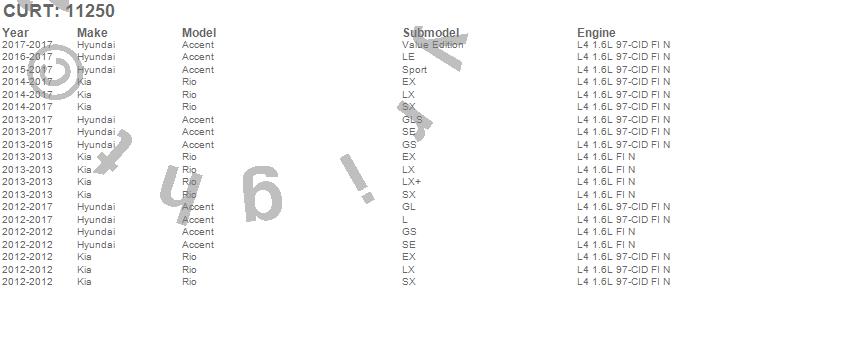 Below is an abbreviated list of applications for the Class I 1.25 in. Receiver Hitch.Accent, Rio, Hyundai, Kia, 2017, 2016, 2015, 2014, 2013, 2012