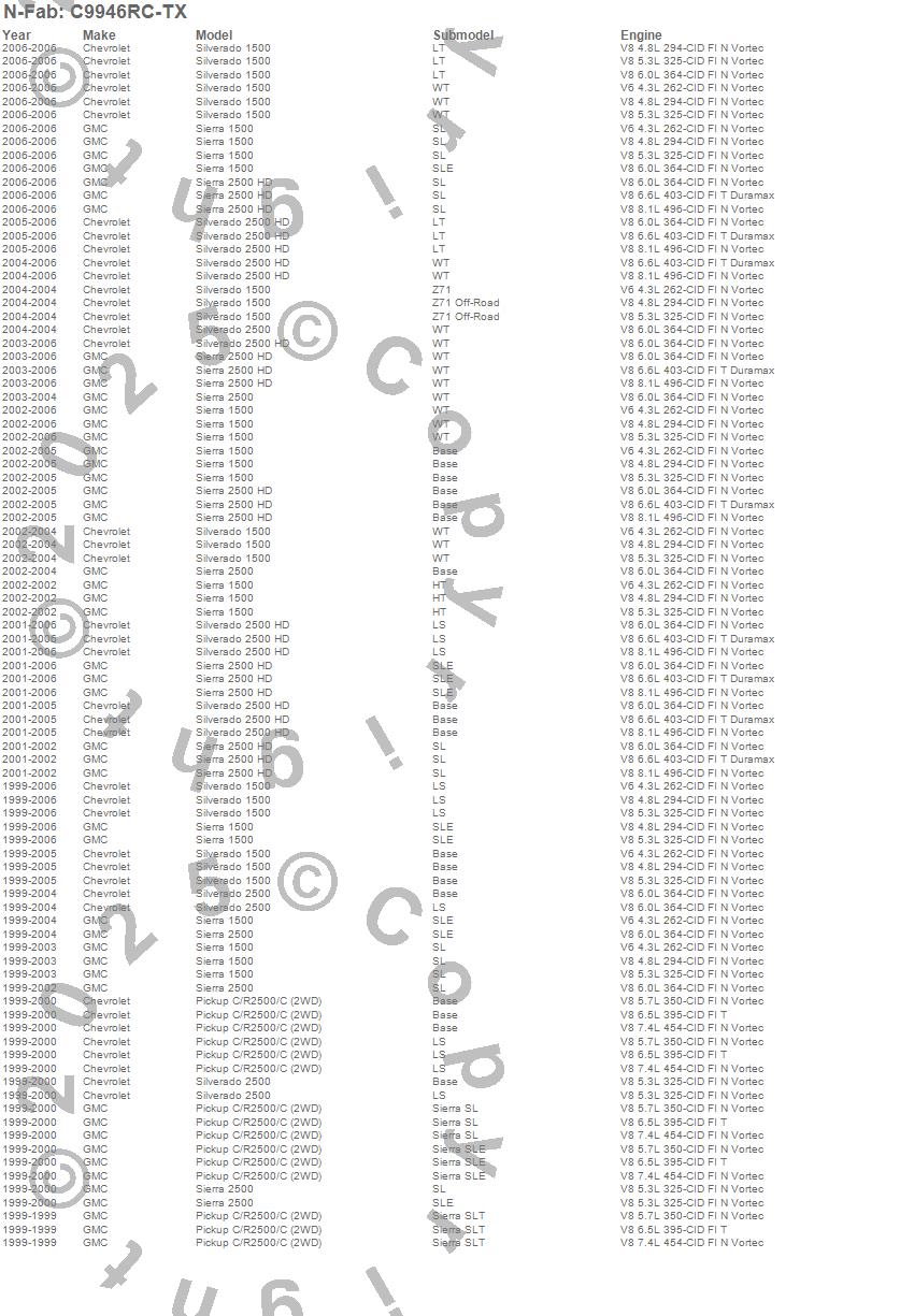 Below is an abbreviated list of applications for the Cab Length Nerf Step Bar.C2500 Pickup, Sierra 1500, Sierra 2500, Sierra 2500 HD, Silverado 1500, Silverado 2500, Silverado 2500 HD, Chevrolet, GMC, 2006, 2005, 2004, 2003, 2002, 2001, 2000, 1999