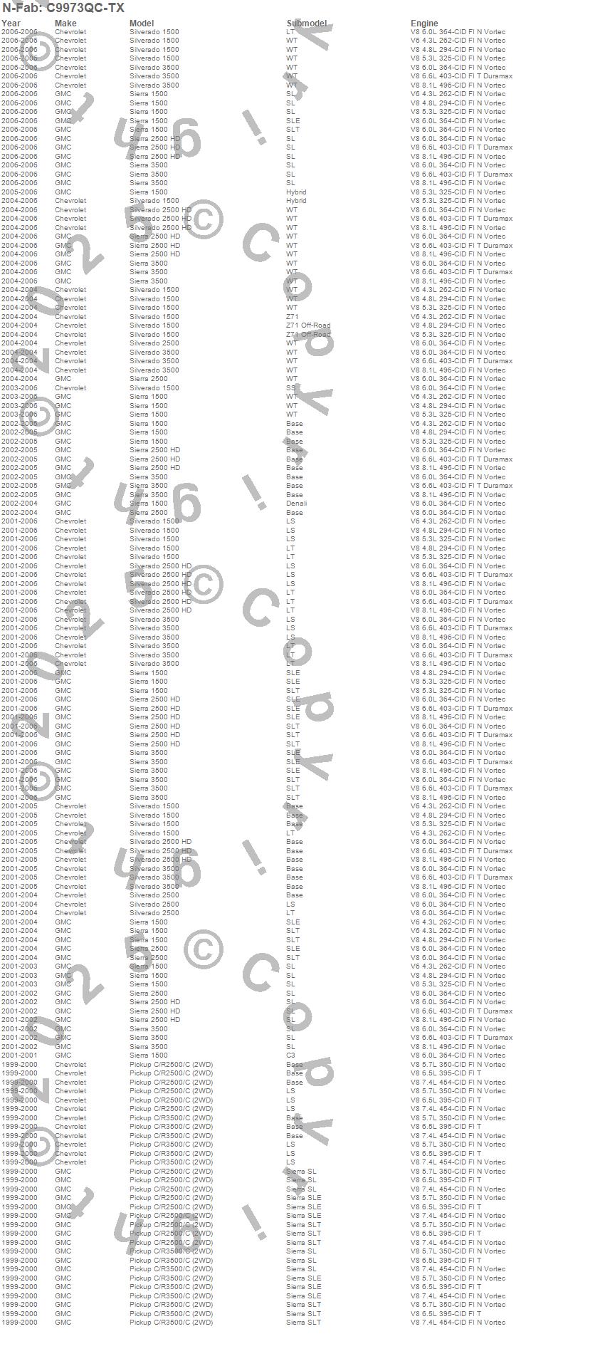 Below is an abbreviated list of applications for the Cab Length Nerf Step Bar.C2500 Pickup, C3500 Pickup, Sierra 1500, Sierra 2500, Sierra 2500 HD, Sierra 3500, Silverado 1500, Silverado 2500, Silverado 2500 HD, Silverado 3500, Chevrolet, GMC, 2006, 2005, 2004, 2003, 2002, 2001, 2000, 1999