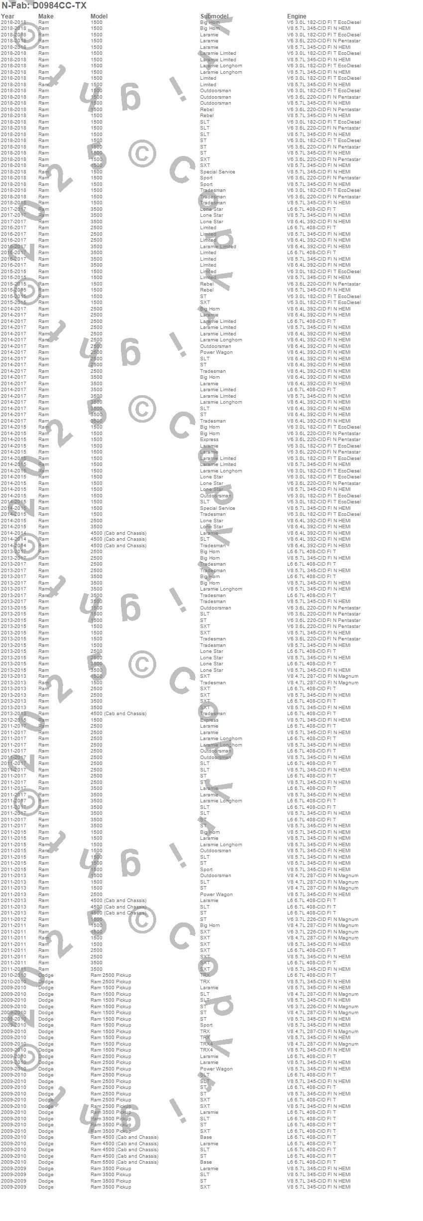 Below is an abbreviated list of applications for the Cab Length Nerf Step Bar.1500, 2500, 3500, 4500, Ram 1500, Ram 2500, Ram 3500, Ram 4500, Ram 5500, Dodge, Ram, 2018, 2017, 2016, 2015, 2014, 2013, 2012, 2011, 2010