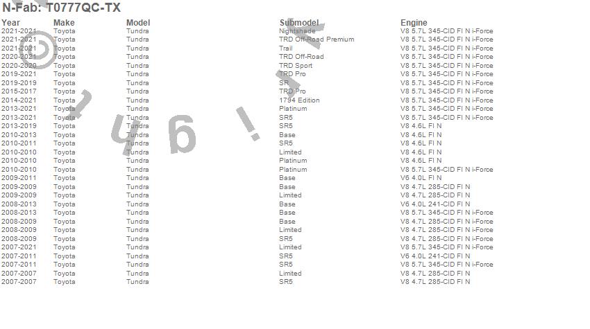 Below is an abbreviated list of applications for the Cab Length Nerf Step Bar.Tundra, Toyota, 2021, 2020, 2019, 2018, 2017, 2016, 2015, 2014, 2013, 2012, 2011, 2010, 2009, 2008, 2007