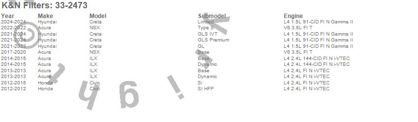 Below is an abbreviated list of applications for the Air Filter.Civic, ILX, NSX, Acura, Honda, 2019, 2018, 2017, 2015, 2014, 2013, 2012