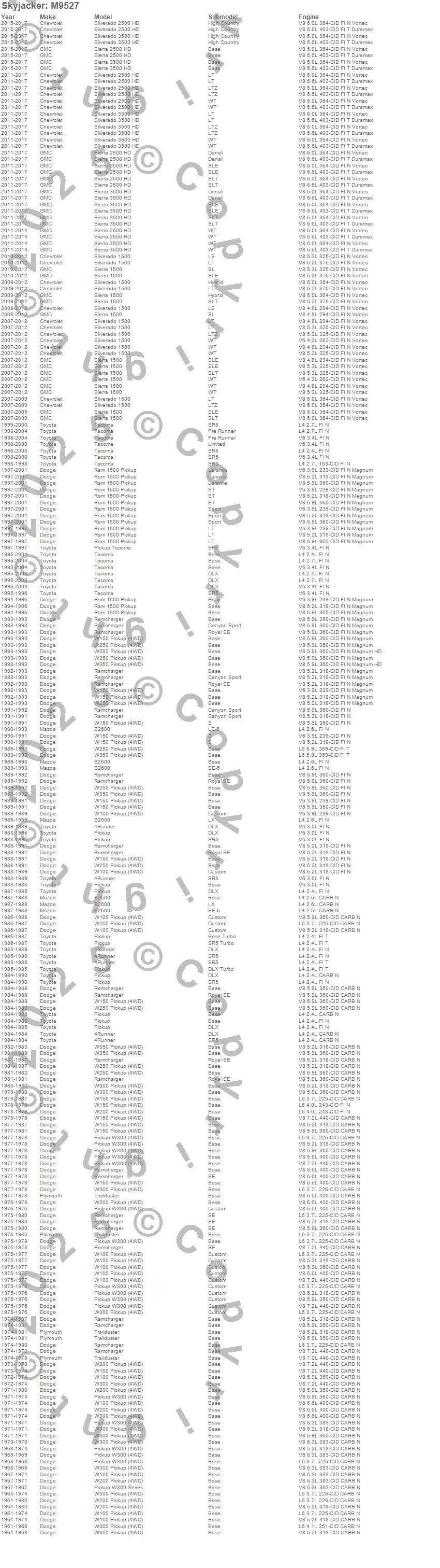 Below is an abbreviated list of applications for the M95 Performance Monotube Shock Absorber.4Runner, B2600, Pickup, Ram 1500 Pickup, Ramcharger, Sierra 1500, Sierra 2500 HD, Silverado 1500, Silverado 2500 HD, Tacoma, Trailduster, W100 Pickup, W100 Series, W150 Pickup, W200 Pickup, W200 Series, W250 Pickup, W300 Pickup, W300 Series, W350 Pickup