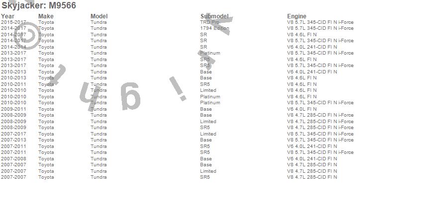 Below is an abbreviated list of applications for the M95 Performance Monotube Shock Absorber.Tundra, Toyota, 2012, 2011, 2010, 2009, 2008, 2007