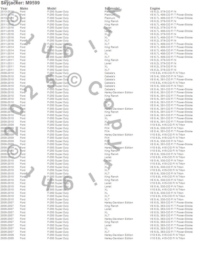 Below is an abbreviated list of applications for the M95 Performance Monotube Shock Absorber.F-250 Super Duty Pickup, F-350 Super Duty Pickup, Ford, 2011, 2010, 2009, 2008, 2007, 2006, 2005