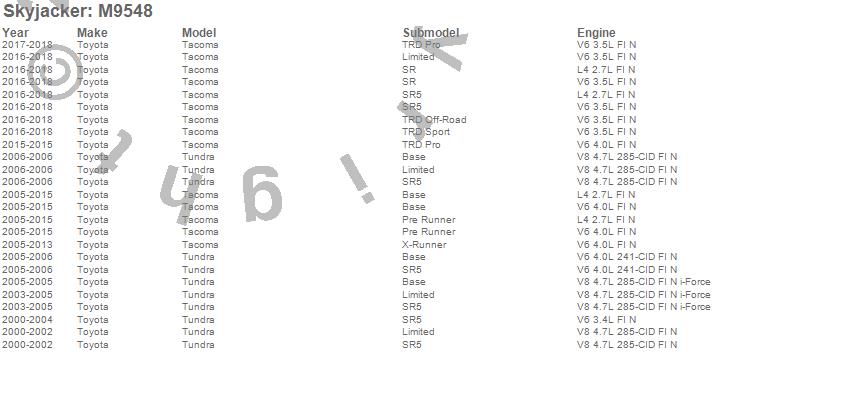 Below is an abbreviated list of applications for the M95 Performance Monotube Shock Absorber.Tacoma, Tundra, Toyota, 2013, 2012, 2011, 2010, 2009, 2008, 2007, 2006, 2005, 2004, 2003, 2002, 2001, 2000