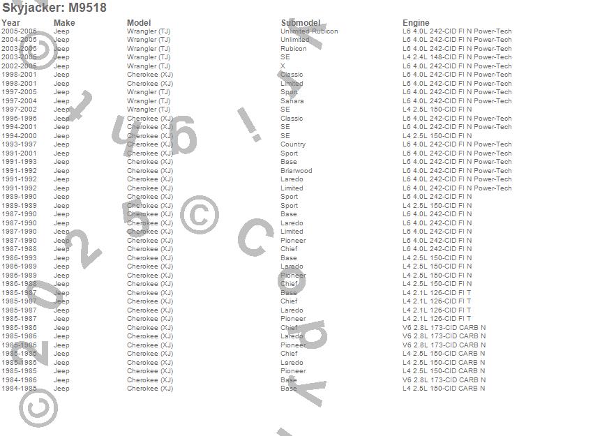 Below is an abbreviated list of applications for the M95 Performance Monotube Shock Absorber.Cherokee (XJ), TJ, Wrangler (LJ), Wrangler (TJ), Jeep, 2005, 2004, 2003, 2002, 2001, 2000, 1999, 1998, 1997, 1996, 1995, 1994, 1993, 1992, 1991