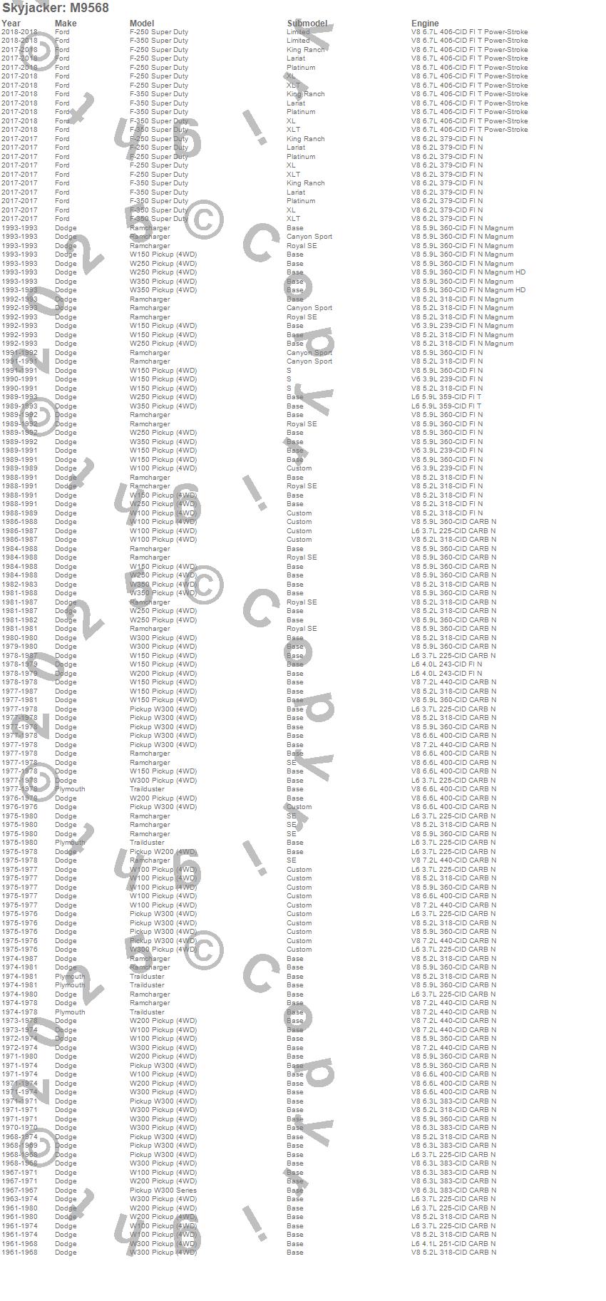 Below is an abbreviated list of applications for the M95 Performance Monotube Shock Absorber.Ramcharger, Trailduster, W100 Pickup, W100 Series, W150 Pickup, W200 Pickup, W200 Series, W250 Pickup, W300 Pickup, W300 Series, W350 Pickup, Dodge, Plymouth, 1993, 1992, 1991, 1990, 1989, 1988, 1987