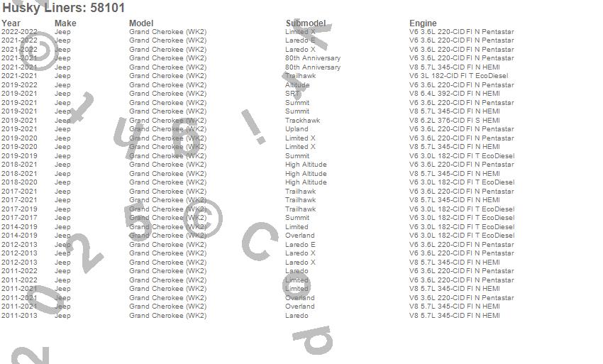Below is an abbreviated list of applications for the Custom Molded Mud Guards.Grand Cherokee (WK2), Jeep, 2022, 2021, 2020, 2019, 2018, 2017, 2016, 2015, 2014, 2013, 2012, 2011