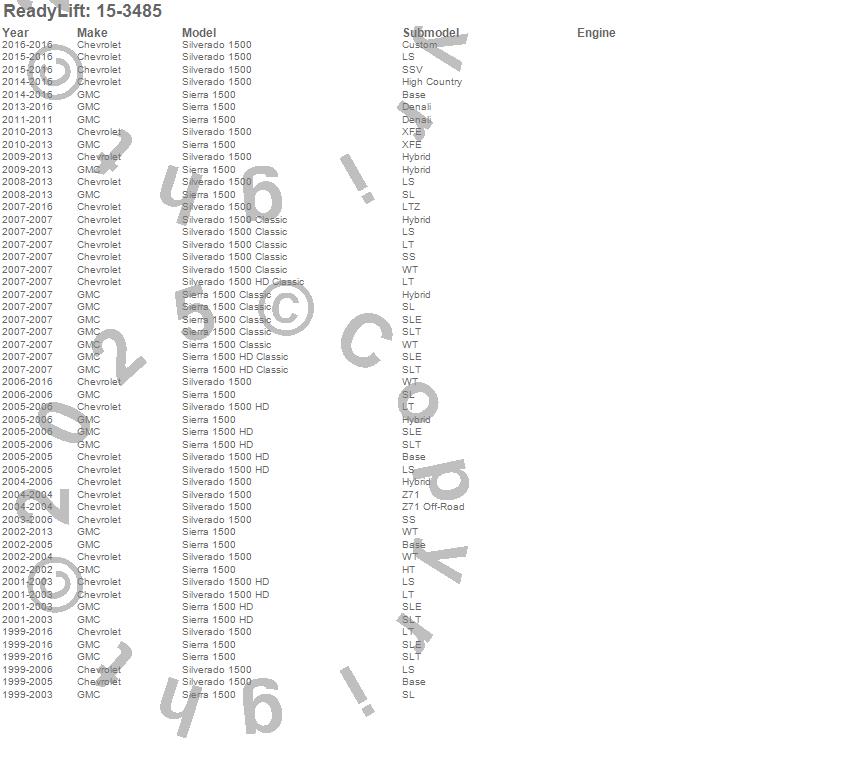 Below is an abbreviated list of applications for the Wheel Spacer.Sierra 1500, Sierra 1500 Classic, Sierra 1500 HD, Sierra 1500 HD Classic, Silverado 1500, Silverado 1500 Classic, Silverado 1500 HD, Silverado 1500 HD Classic, Chevrolet, GMC, 2016, 2015, 2014, 2013, 2012, 2011, 2010, 2009, 2008, 2007