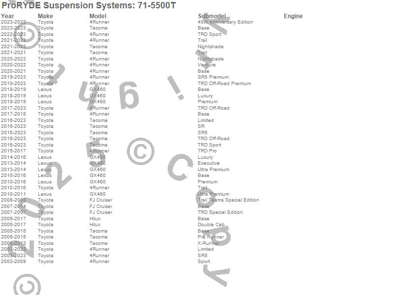 Brand: ProRYDE Suspension SystemsPart Number: 71-5500TSuspension Front Leveling Kit Type: Front - Adjustable - 1.5-3 in. Lift - 2.0 Hours Install Time - Adjust Prior To InstallUPC: 029476155007
