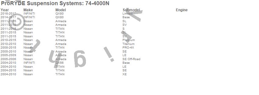 Brand: ProRYDE Suspension SystemsPart Number: 74-4000NSuspension Front Leveling Kit Type: Front - Adjustable - 1.5-2.75 in. Lift - 1.9 Hours Install Time - On Vehicle AdjustmentUPC: 029476744003