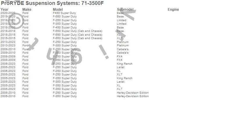 Brand: ProRYDE Suspension SystemsPart Number: 71-3500FSuspension Front Leveling Kit Type: Front - Adjustable - 2-2.5 in. Lift - 2.2 Hours Install Time - Adjust Prior To InstallUPC: 029476713504