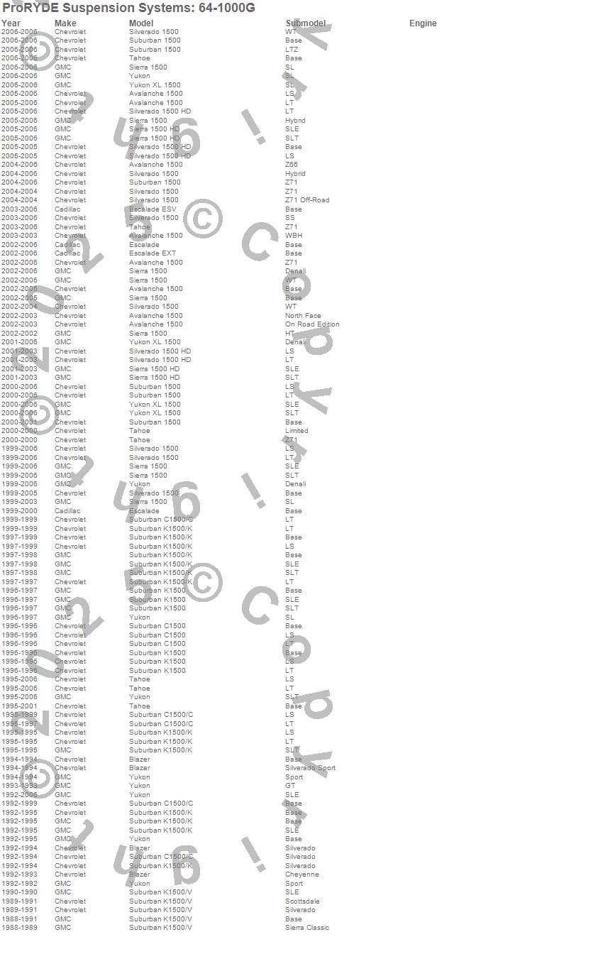 Brand: ProRYDE Suspension SystemsPart Number: 64-1000GSuspension Front Leveling Kit Type: Front - Adjustable - 0-3 in. Lift - 1.5 Hours Install TimeUPC: 029476410007
