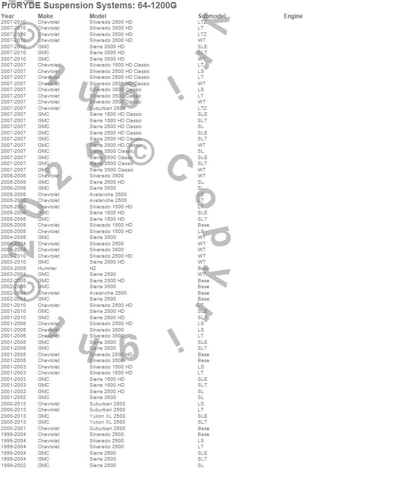 Brand: ProRYDE Suspension SystemsPart Number: 64-1200GSuspension Front Leveling Kit Type: Front - Adjustable - 0-2 in. Lift - 1.8 Hours Install TimeUPC: 029476412001