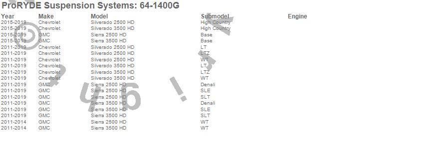 Brand: ProRYDE Suspension SystemsPart Number: 64-1400GSuspension Front Leveling Kit Type: Front - Adjustable - 0-2.25 in. Lift - 1.5 Hours Install TimeUPC: 029476414005