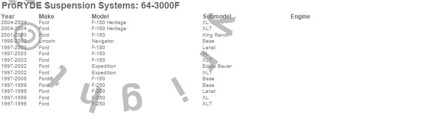 Brand: ProRYDE Suspension SystemsPart Number: 64-3000FSuspension Front Leveling Kit Type: Front - Adjustable - 0-2.5 in. Lift - 1.1 Hours Install TimeUPC: 029476430005