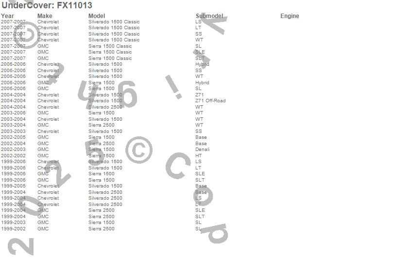 Below is an abbreviated list of applications for the FLEX Tonneau Cover.Sierra 1500, Sierra 1500 Classic, Sierra 2500, Silverado 1500, Silverado 1500 Classic, Silverado 2500, Chevrolet, GMC, 2007, 2006, 2005, 2004, 2003, 2002, 2001, 2000, 1999