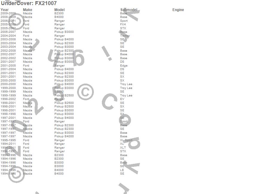 Below is an abbreviated list of applications for the FLEX Tonneau Cover.B2300, B2500, B3000, B4000, Ranger, Ford, Mazda, 2011, 2010, 2009, 2008, 2007, 2006, 2005, 2004, 2003, 2002, 2001, 2000, 1999