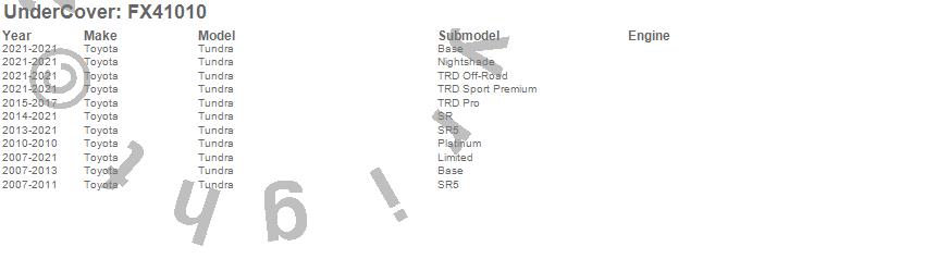 Below is an abbreviated list of applications for the FLEX Tonneau Cover.Tundra, Toyota, 2021, 2020, 2019, 2018, 2017, 2016, 2015, 2014, 2013, 2012, 2011, 2010, 2009, 2008, 2007