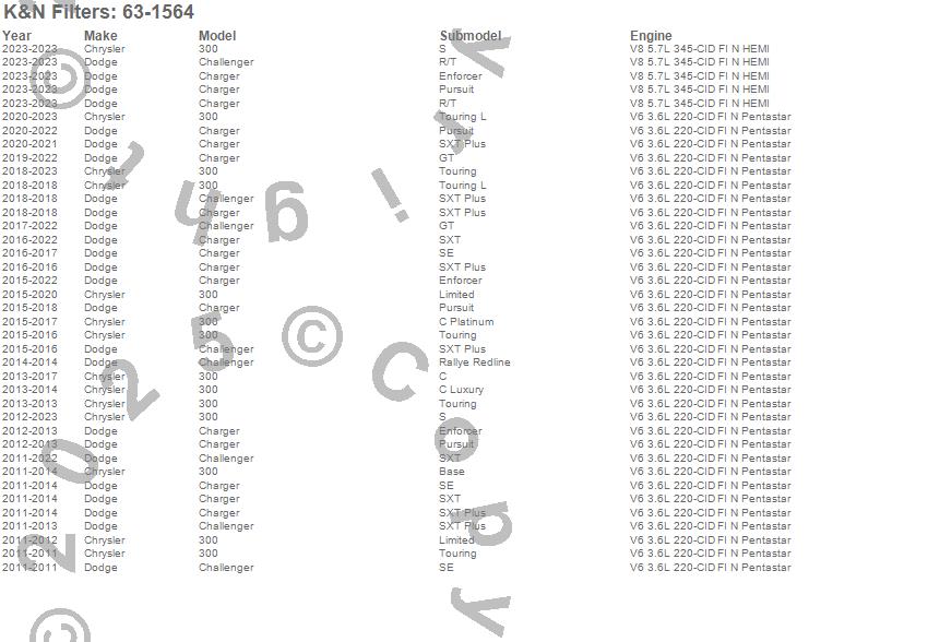 Below is an abbreviated list of applications for the 63 Series Aircharger Kit.300, Challenger, Charger, Chrysler, Dodge, 2019, 2018, 2017, 2016, 2015, 2014, 2013, 2012, 2011