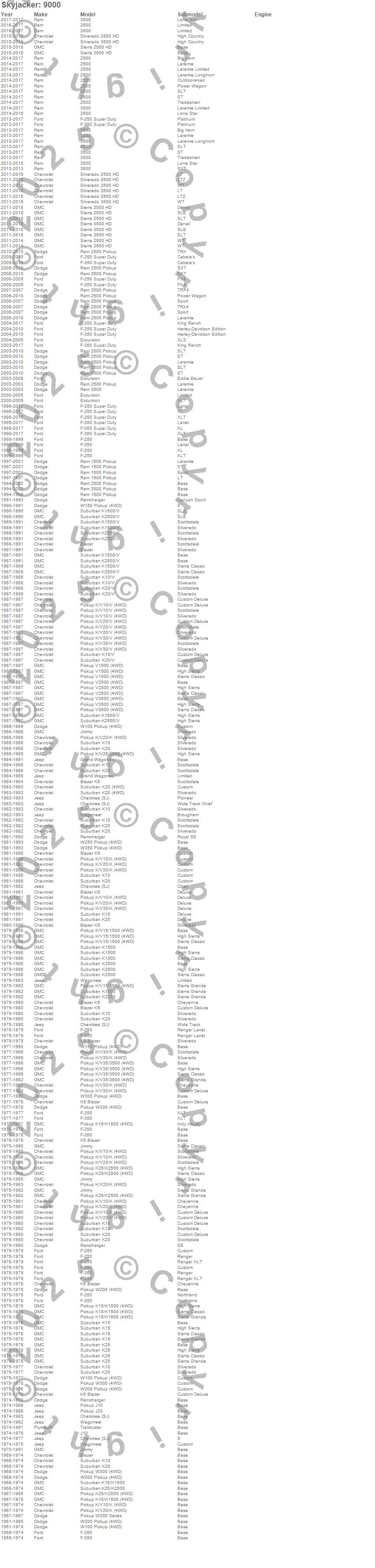 Below is an abbreviated list of applications for the Steering Stabilizer.Blazer, Blazer K5, Cherokee, Excursion, F-250 Pickup, F-250 Super Duty Pickup, F-350 Pickup, F-350 Super Duty Pickup, Grand Wagoneer, J10, J20, Jimmy, K10 Pickup, K10 Suburban, K15 Pickup, K15 Suburban, K15/K1500 Pickup, K15/K1500 Suburban, K1500 Pickup, K1500 Suburban