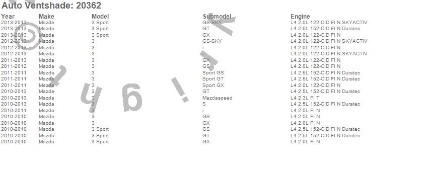 Below is an abbreviated list of applications for the Carflector Stone/Bug Deflector.3, 3 Sport, Mazda, 2013, 2012, 2011, 2010