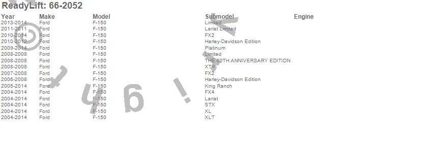 Below is an abbreviated list of applications for the Front Leveling Kit.F-150, Ford, 2014, 2013, 2012, 2011, 2010, 2009, 2008, 2007, 2006, 2005, 2004