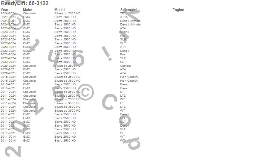 Below is an abbreviated list of applications for the Rear Block Kit.Sierra 2500 HD, Sierra 3500 HD, Silverado 2500 HD, Silverado 3500 HD, Chevrolet, GMC, 2024, 2023, 2022, 2021, 2020, 2019, 2018, 2017, 2016, 2015, 2014, 2013, 2012, 2011