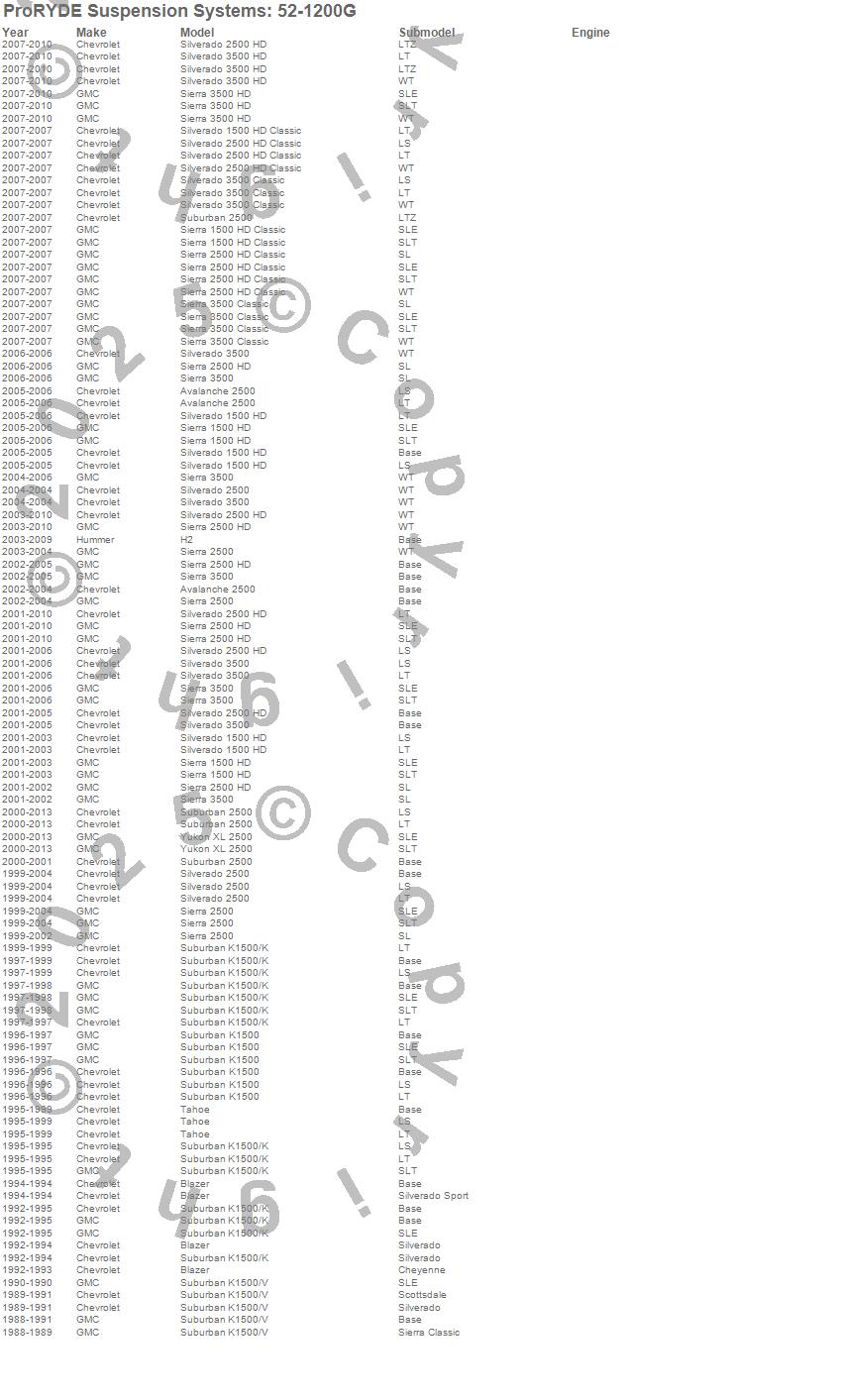 Below is an abbreviated list of applications for the SuperBlok 3 In 1 Block and U-Bolt Kit.Avalanche 2500, Blazer, H2, K1500 Suburban, Sierra 1500 HD, Sierra 1500 HD Classic, Sierra 2500, Sierra 2500 HD, Sierra 2500 HD Classic, Sierra 3500, Sierra 3500 Classic, Sierra 3500 HD, Silverado 1500 HD, Silverado 1500 HD Classic, Silverado 2500, Silverado 2500 HD, Silverado 2500 HD Classic, Silverado 3500, Silverado 3500 Classic, Silverado 3500 HD