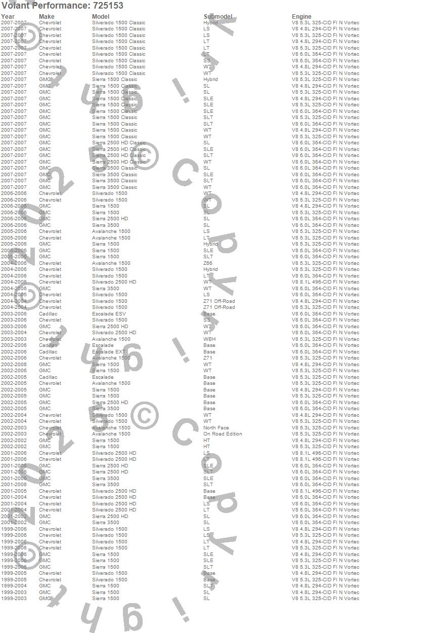 Below is an abbreviated list of applications for the Vortice Throttle Body Spacer.Avalanche 1500, Escalade, Escalade ESV, Escalade EXT, Sierra 1500, Sierra 1500 Classic, Sierra 2500 HD, Sierra 2500 HD Classic, Sierra 3500, Sierra 3500 Classic, Silverado 1500, Silverado 1500 Classic, Silverado 2500 HD, Cadillac, Chevrolet, GMC, 2007, 2006, 2005, 2004
