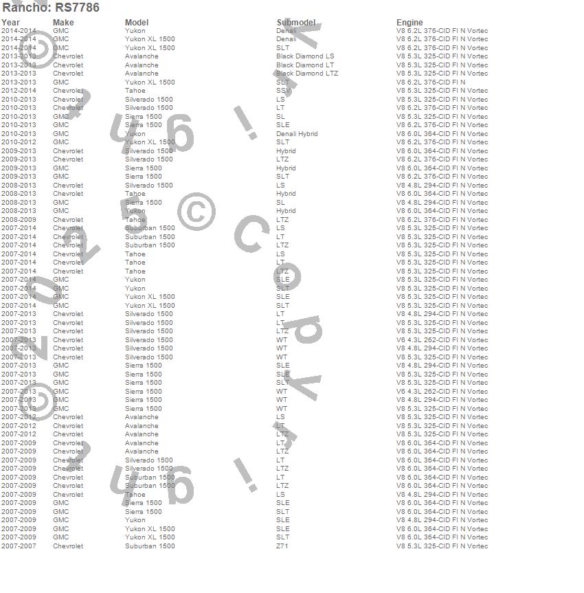 Below is an abbreviated list of applications for the RS7000MT Monotube Shock.AVALANCHE, AVALANCHE (Canadian), SIERRA 1500, SIERRA 1500 (Canadian), SILVERADO 1500, SILVERADO 1500 (Canadian), SUBURBAN 1500, SUBURBAN 1500 (Canadian), TAHOE, TAHOE (Canadian), YUKON, YUKON (Canadian), YUKON XL 1500, YUKON XL 1500 (Canadian), CHEVROLET, GMC, 2013, 2012, 2011, 2010
