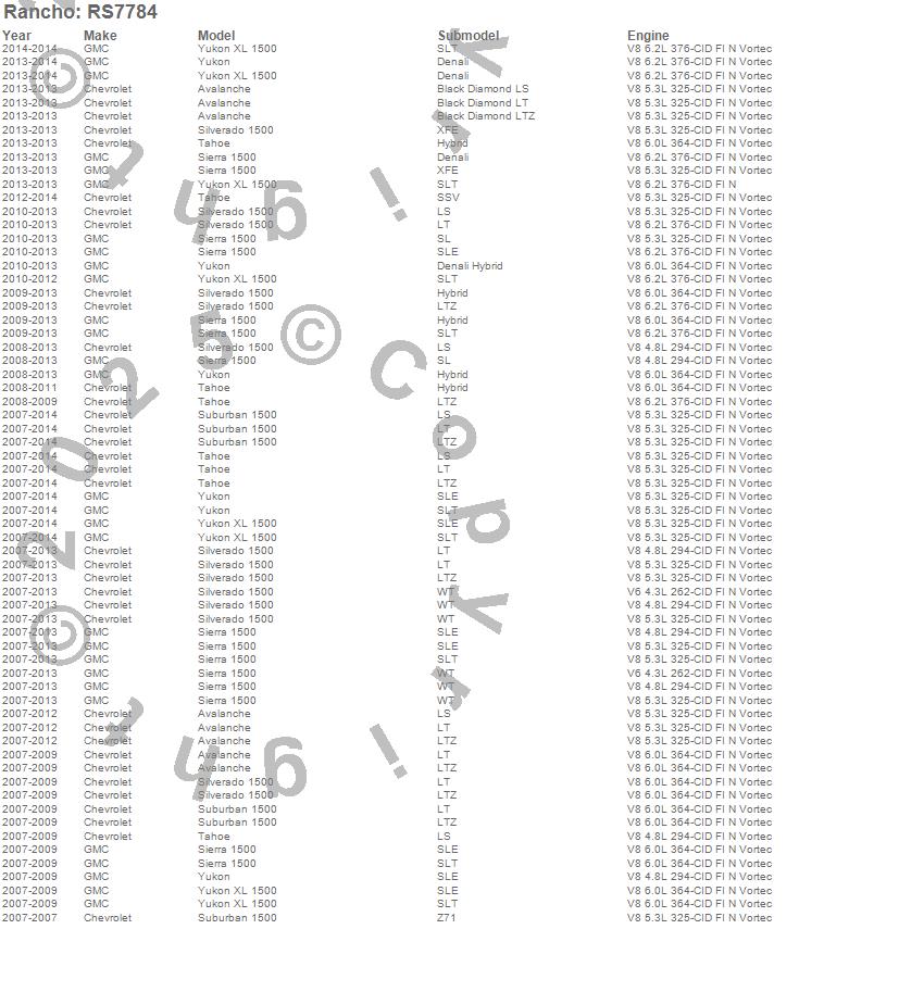 Below is an abbreviated list of applications for the RS7000MT Monotube Shock.AVALANCHE, SIERRA 1500, SILVERADO 1500, SUBURBAN 1500, TAHOE, YUKON, YUKON XL 1500, CHEVROLET, GMC, 2012, 2011, 2010, 2009, 2008, 2007